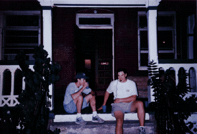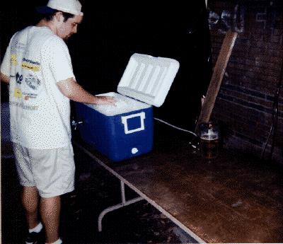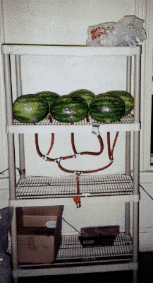 Here is Price and his friend from home's brain child. Take six watermelons and hollow them out. Then tap all of them to one spigot. Ingenious! |